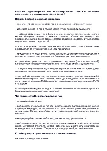 Сельская администрация МО Большежуковское сельское поселение напоминает, что выход на лед крайне опасен!